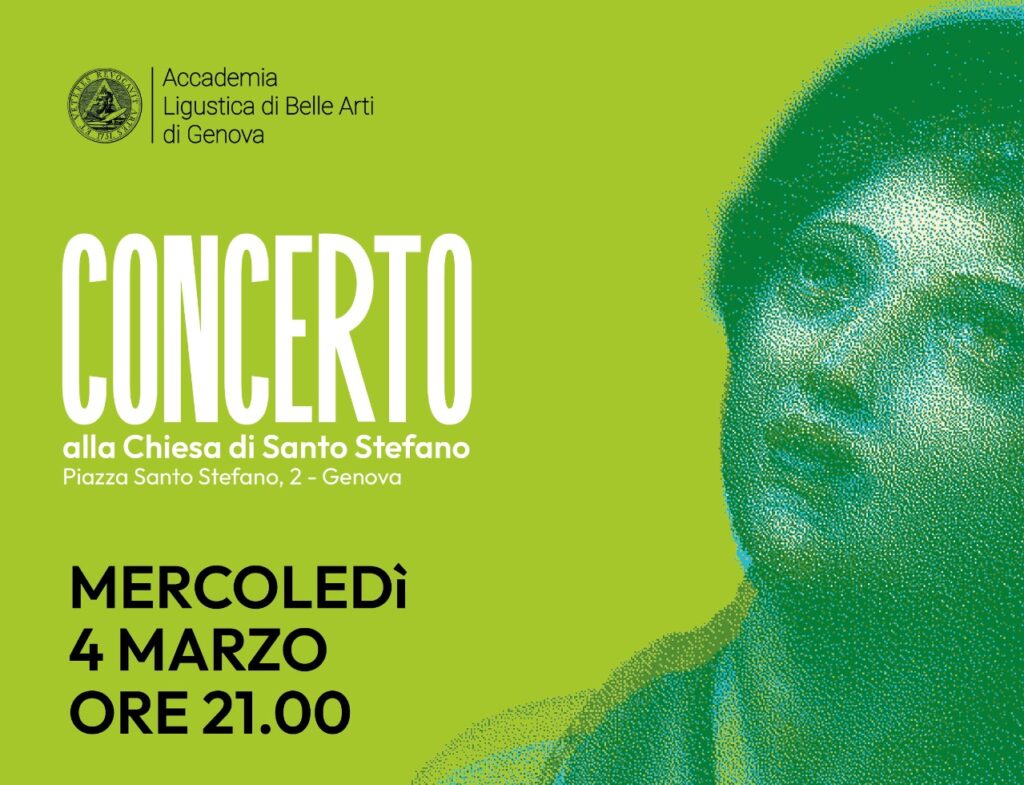 Si annuncia il Concerto organizzato dall’Accademia Lingustica di Belle Arti di Genova in collaborazione con il Conservatorio “N. Paganini”. Data: 4 marzo 2026 Luogo: Piazza Santo Stefano 2, Genova Programma del concerto: https://museo.accademialigustica.it/mostra-evento/concerto-alla-chiesa-di-santo-stefano/